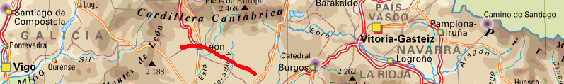 Tomamos un café y nos pusimos en marcha de nuevo, salimos a toda pastilla y pronto me distancié de Julio y Juan con tan mala suerte de que por ir mirando para atrás a ver si los veía venir me caí y me hice bastante daño en la cadera y en la muñeca derecha, ninguno de estos dos sitios me dejó de doler el resto del Camino hasta Santiago.
